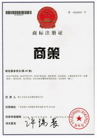 热烈祝贺!本公司【商策】商标第45类注册成功取得商标证书